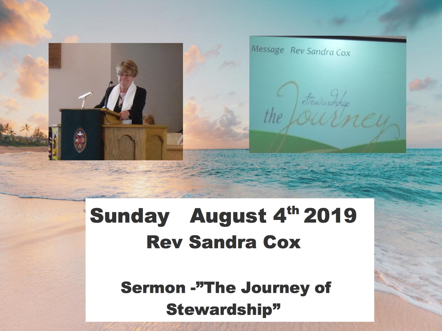 Rev Sandra Cox's sermon - The Journey of Stewardship" begins at minute 36.00